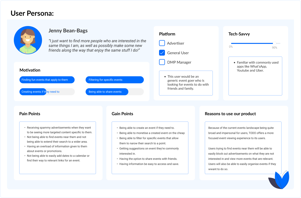 Our end user, who makes up the bulk of what will be our entire user base, is primarily going to be on the lookout for local events that are applicable to their interests. As such, they will want to be able to filter for things that apply to them so they can reduce the cognitive load on themselves.